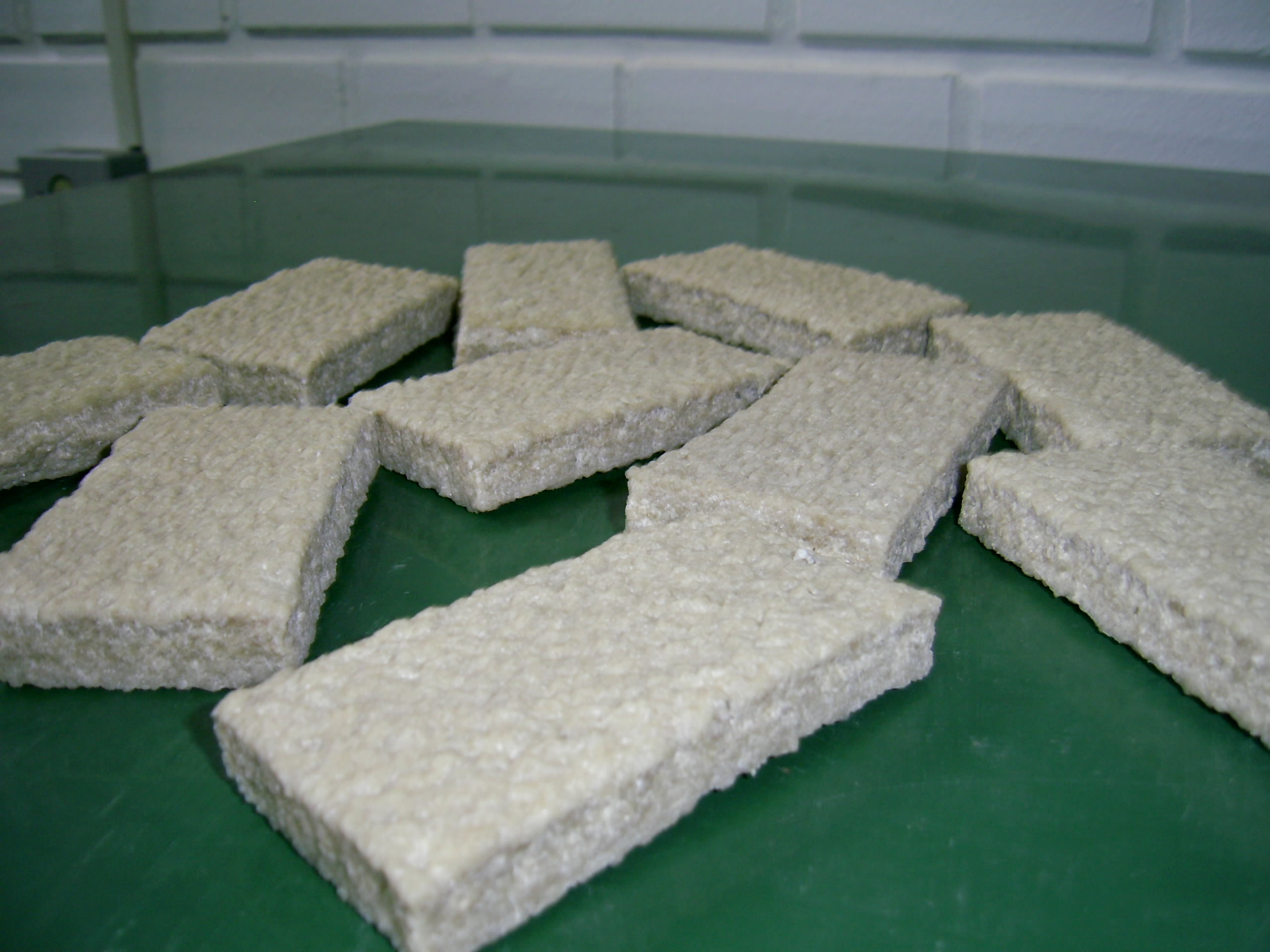 Produzido em placas (no tamanho de 1,0x0,6m) ou cortado em padaços (10x4cm), com espessura entre 12 e 20mm.